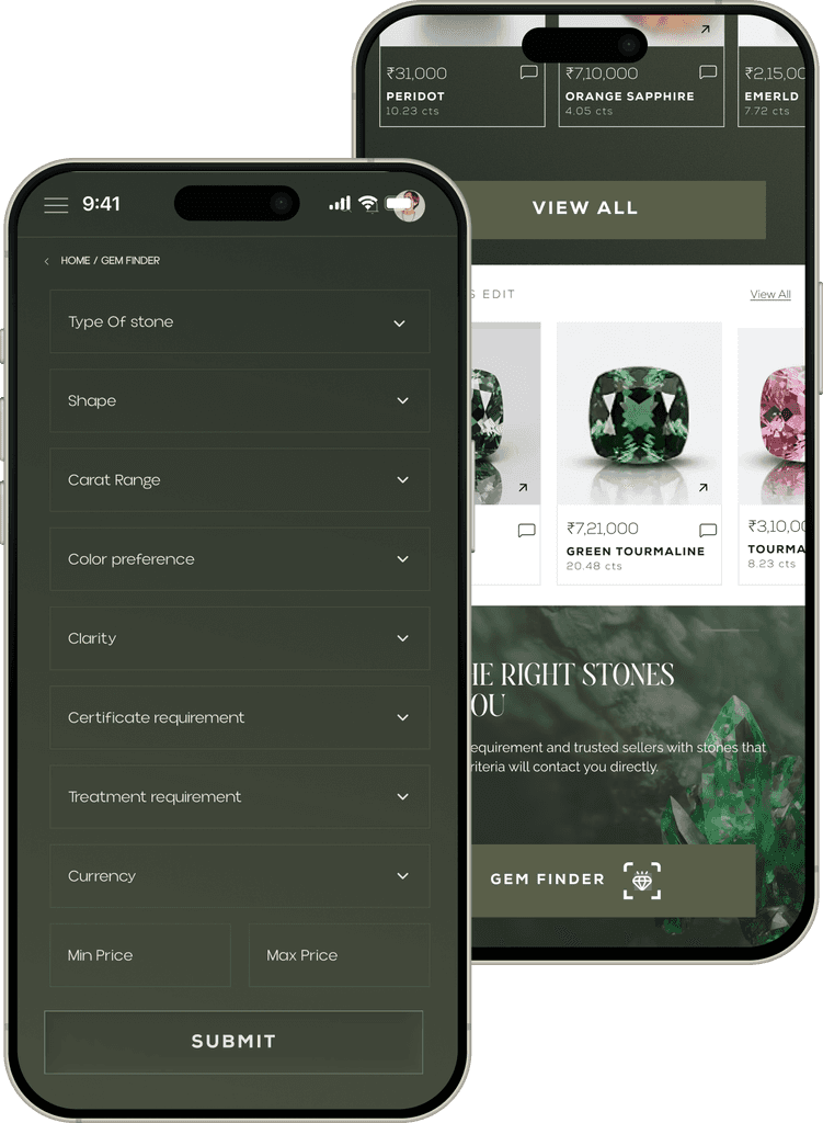 Gemstones are organised by stone, origin, carat, and price — reflecting standard trade workflows.